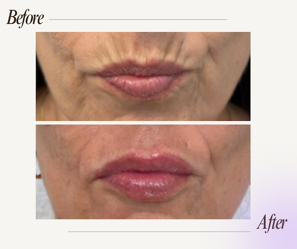 We treated her upper lip lines and small lips with Teosyal RHA 2, adding volume and definition to the lips and smoothing out the upper lip lines.